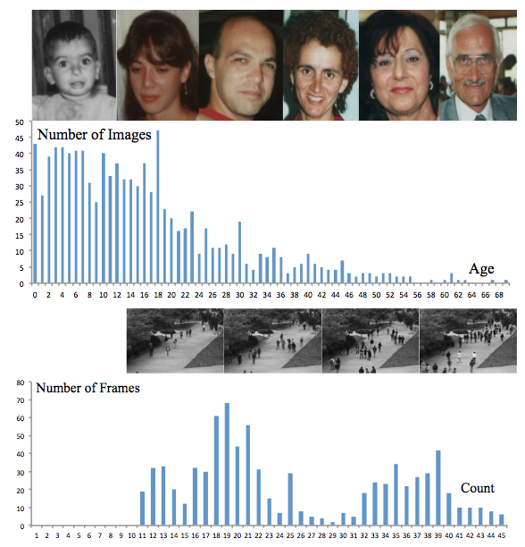 Age estimation and crowd counting both suffer from sparse and imbalanced training data distribution. Top: FG-NET facial age dataset. Bottom: UCSD crowd dataset.