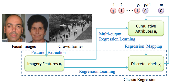 A number of computer vision problems such as human age estimation, crowd density estimation and body/face pose (view angle) estimation can be formulated as a regression problem by learning a mapping function between a high dimensional vector-formed feature input and a scalarvalued output. Such a learning problem is made difficult due to sparse and imbalanced training data and large feature variations caused by both uncertain viewing conditions and intrinsic ambiguities between observable visual features and the scalar values to be estimated. Encouraged by the recent success in using attributes for solving classification problems with sparse training data, this paper introduces a novel cumulative attribute concept for learning a regression model when only sparse and imbalanced data are available. More precisely, low-level visual features extracted from sparse and imbalanced image samples are mapped onto a cumulative attribute space where each dimension has clearly defined semantic interpretation (a label) that captures how the scalar output value (e.g. age, people count) changes continuously and cumulatively. Extensive experiments show that our cumulative attribute framework gains notable advantage on accuracy for both age estimation and crowd counting when compared against conventional regression models, especially when the labelled training data is sparse with imbalanced sampling.