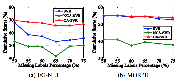 Age estimation performance with sparse and imbalanced data measured using cumulative scores (the higher the better).