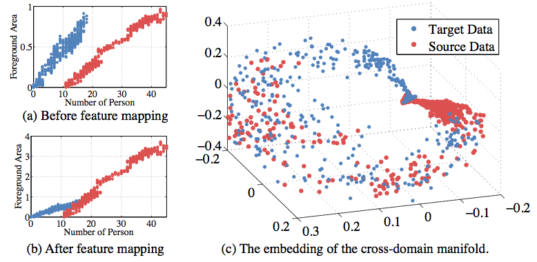 (a)-(b) Performing feature mapping using the corresponding points to align the feature range of ucsd and hallway datasets. (c) The embedding of the cross-domain manifold using the source data ucsd (red dots) and target data hallway (blue dots).